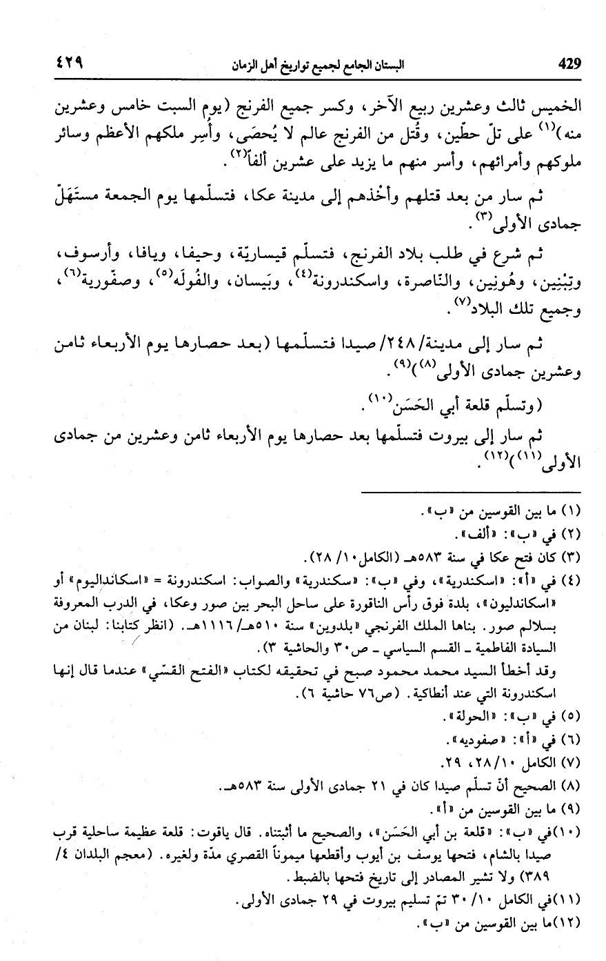 (¬4) في "أ": "اسكندرية"، وفي "ب": "سكندرية" والصواب: اسكندرونة = "اسكانداليوم" أو "اسكاندليون"، بلدة فوق رأس الناتورة على ساحل البحر بين صور وعكا، في الدرب المعروفة بسلالم صور. بناها الملك الفرنجي "بلدوين" سنة 510 هـ/ 116 اهـ. (انظر كتابنا: لبنان من السيادة الفاطمية - القسم السياسي - ص 30 والحاشية 3).