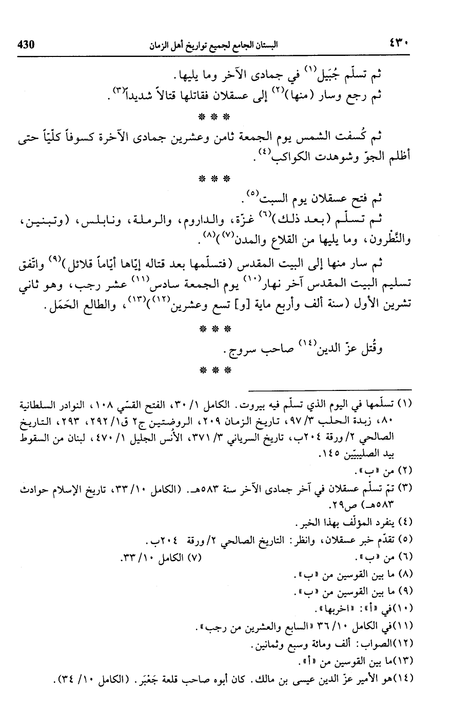(¬3) تم تسلّم عسقلان في آخر جمادى الآخر سنة 583 هـ. (الكامل 10/ 33، تاريخ الإسلام حوادث 583 هـ) ص 29.