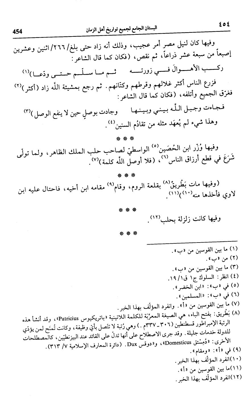 (¬8) بَطريق: بفتح الباء، هي الصيغة المعربَة للكلمة اللاتينية "باتريكيوس"، Particius وقد أنشأ هذه الرتبة الإمبراطور قسطنطين (306 - 337 م) وهى رُتبة لا تتّصل بأيّ وظيفة، وكانت تُمنَح لمن يؤدّي للدولة خدمات جليلة. وقد جرى الاصطلاح على أنها قال على القائد عند البيزنطيّين، كالمصطلحات الأخرى: "دُمِستق"، و" Domesticus"،