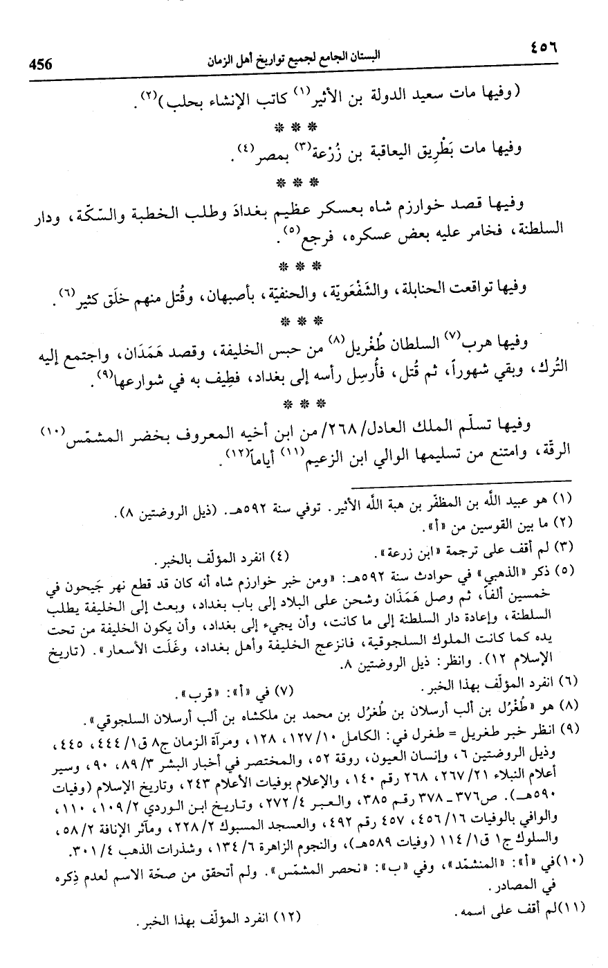 (¬9) انظر خبر طغريل = طغرل في: الكامل 10/ 127، 128، ومرآة الزمان ج 8 ق 1/ 444، 445، وذيل الروضتين 6، وإنسان العيون، ورقة 52، والمختصر في أخبار البشر 3/ 89، 90، وسير أعلام النبلاء 21/ 267، 268 رقم 140، والإعلام بوفيات الأعلام 243، وتاريخ الإسلام (وفيات 590 هـ). ص 376 - 378 رقم 385، والعبر 4/ 272، وتاريخ ابن الوردي 2/ 109، 110، والوافي بالوفيات 16/ 456، 457 رقم 492، والعسجد المسبوك 2/ 228، ومآثر الإنافة 2/ 58، والسلوك ج 1 ق 1/ 114 (وفيات 589 هـ)، والنجوم الزاهرة 6/ 134، وشذرات الذهب 4/ 301.
