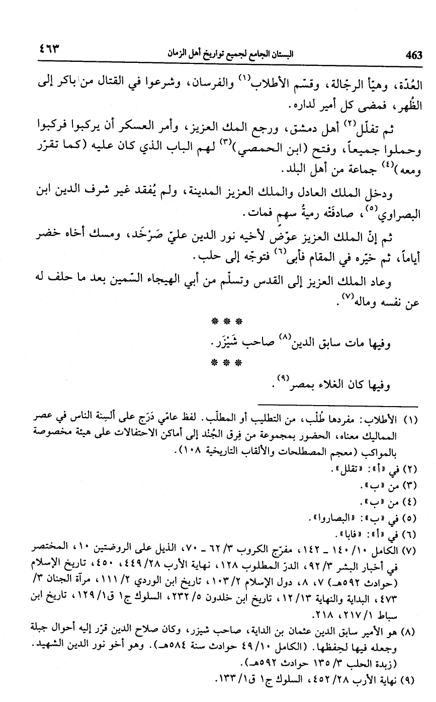 (¬1) الأطلاب: مفردها طُلب، من التطليب أو المطلّب. لفظ عامّي دَرَج على ألسِنة الناس في عصر المماليك معناه، الحضور بمجموعة من فِرق الجُند إلى أماكن الاحتفالات على هيئة مخصوصة بالمواكب (معجم المصطلحات والألقاب التاريخية 108).