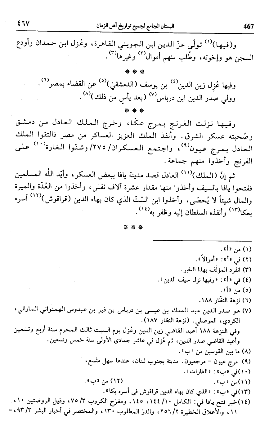 (¬14) خبر فتح يافا في: الكامل 10/ 144، 145، ومفرّج الكروب 3/ 75، وذيل الروضتين 10، 11، والأعلاق الخطيرة 2/ 256، والدرّ المطلوب 130، والمختصر في أخبار البشر 3/ 93،=