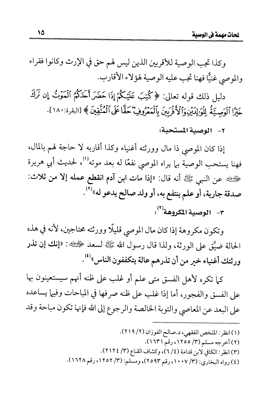 وتكون مكروهة إذا كان مال الموصي قليلًا وورثته محتاجين، لأنه في هذه الحالة ضيق على الورثة، ولذا قال رسول الله - صلى الله عليه وسلم - لسعد - رضي الله عنه -: «إنك إن تذر ورثتك أغنياء خير من أن تذرهم عالة يتكففون الناس» (¬4).