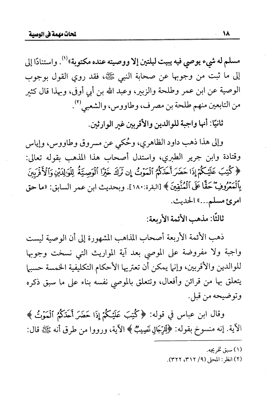 مسلم له شيء يوصي فيه يبيت ليلتين إلا ووصيته عنده مكتوبة» (¬1). واستنادًا إلى ما ثبت من وجوبها عن صحابة النبي - صلى الله عليه وسلم -، فقد روي القول بوجوب الوصية عن ابن عمر وطلحة والزبير، وعبد الله بن أبي أوفى، وبهذا قال كثير من التابعين منهم طلحة بن مصرف، وطاووس، والشعبي (¬2).