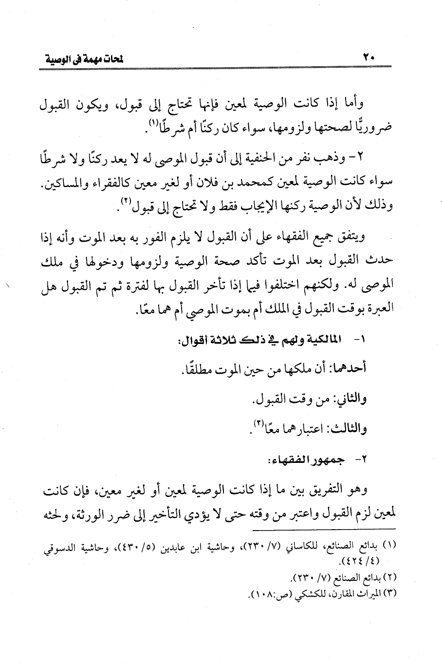 2 - وذهب نفر من الحنفية إلى أن قبول الموصى له لا يعد ركنًا ولا شرطًا سواء كانت الوصية لمعين كمحمد بن فلان أو لغير معين كالفقراء والمساكين.