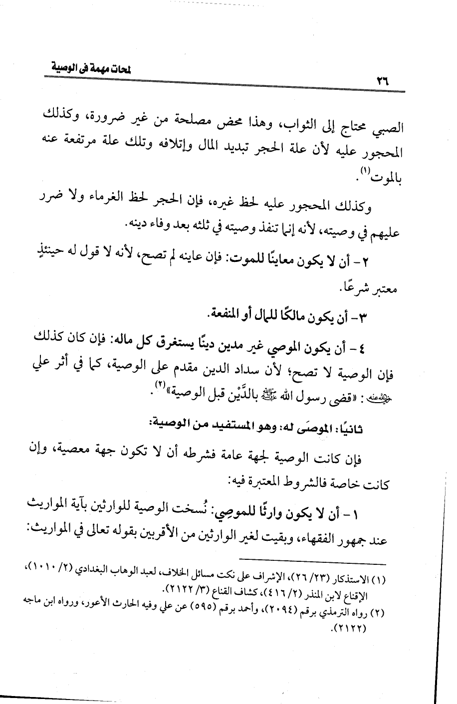 1 - أن لا يكون وارثًا للموِصي: نُسخت الوصية للوارثين بآية المواريث عند جمهور الفقهاء، وبقيت لغير الوارثين من الأقربين بقوله تعالى في المواريث: