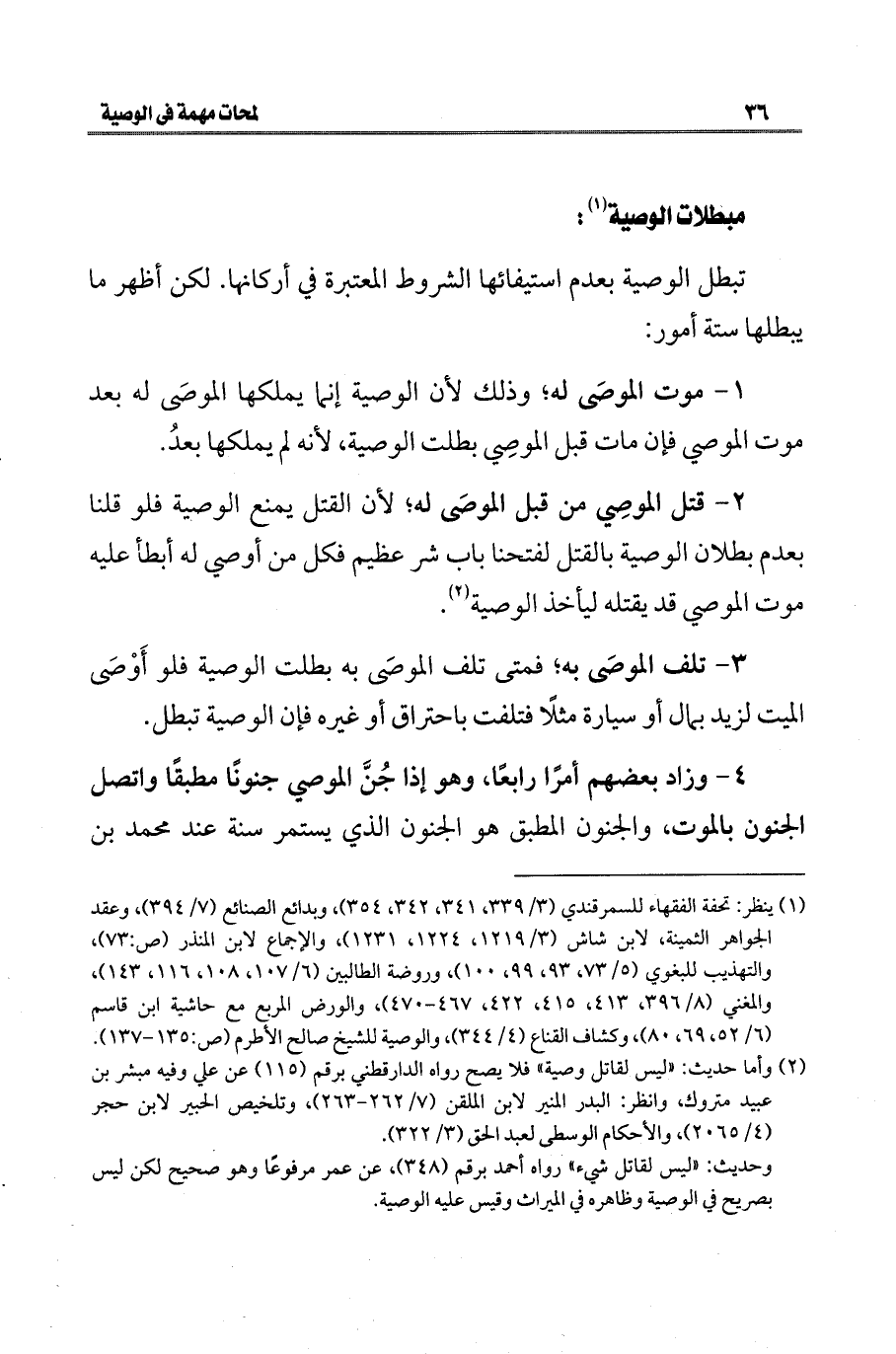 (¬2) وأما حديث: «ليس لقاتل وصية» فلا يصح رواه الدارقطني برقم (115) عن علي وفيه مبشر بن عبيد متروك، وانظر: البدر المنير لابن الملقن (7/ 262 - 263)، وتلخيص الحبير لابن حجر (4/ 2065)، والأحكام الوسطى لعبد الحق (3/ 322).