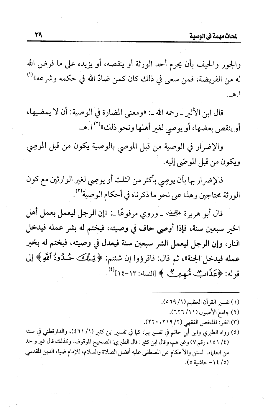 والجور والحيف بأن يحرم أحد الورثة أو ينقصه، أو يزيده على ما فرض الله له من الفريضة، فمن سعى في ذلك كان كمن ضاد الله في حكمه وشرعه» (¬1) ا. هـ.