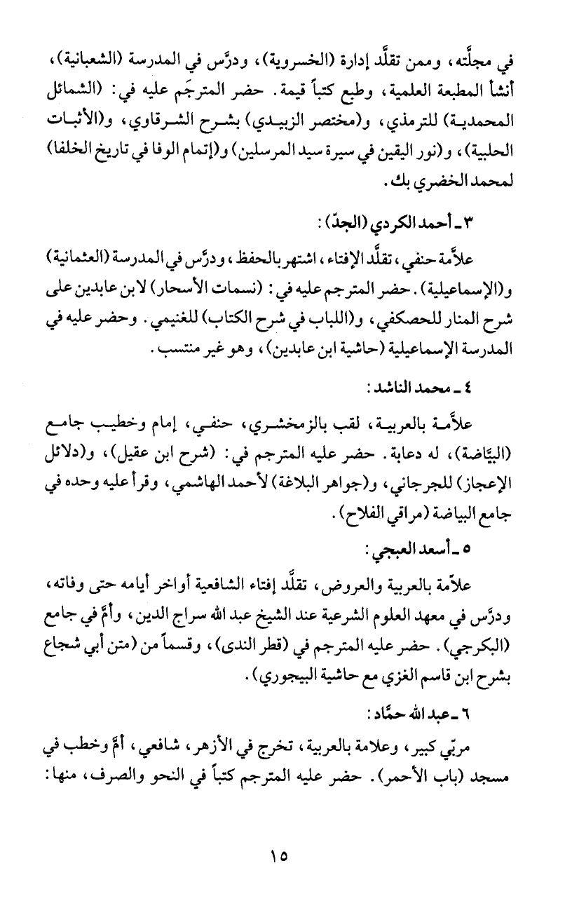 و (الإسماعيلية). حضر المترجم عليه في: (نسمات الأسحار) لابن عابدين على