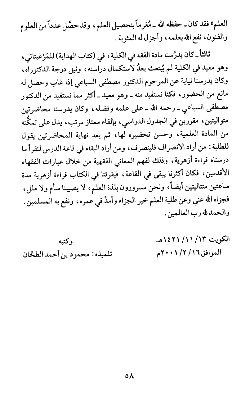 ئالثاَ - كان يدرِّسنا مادة الفقه في الكلية، في (كتاب الهداية) للمَزغيناني،