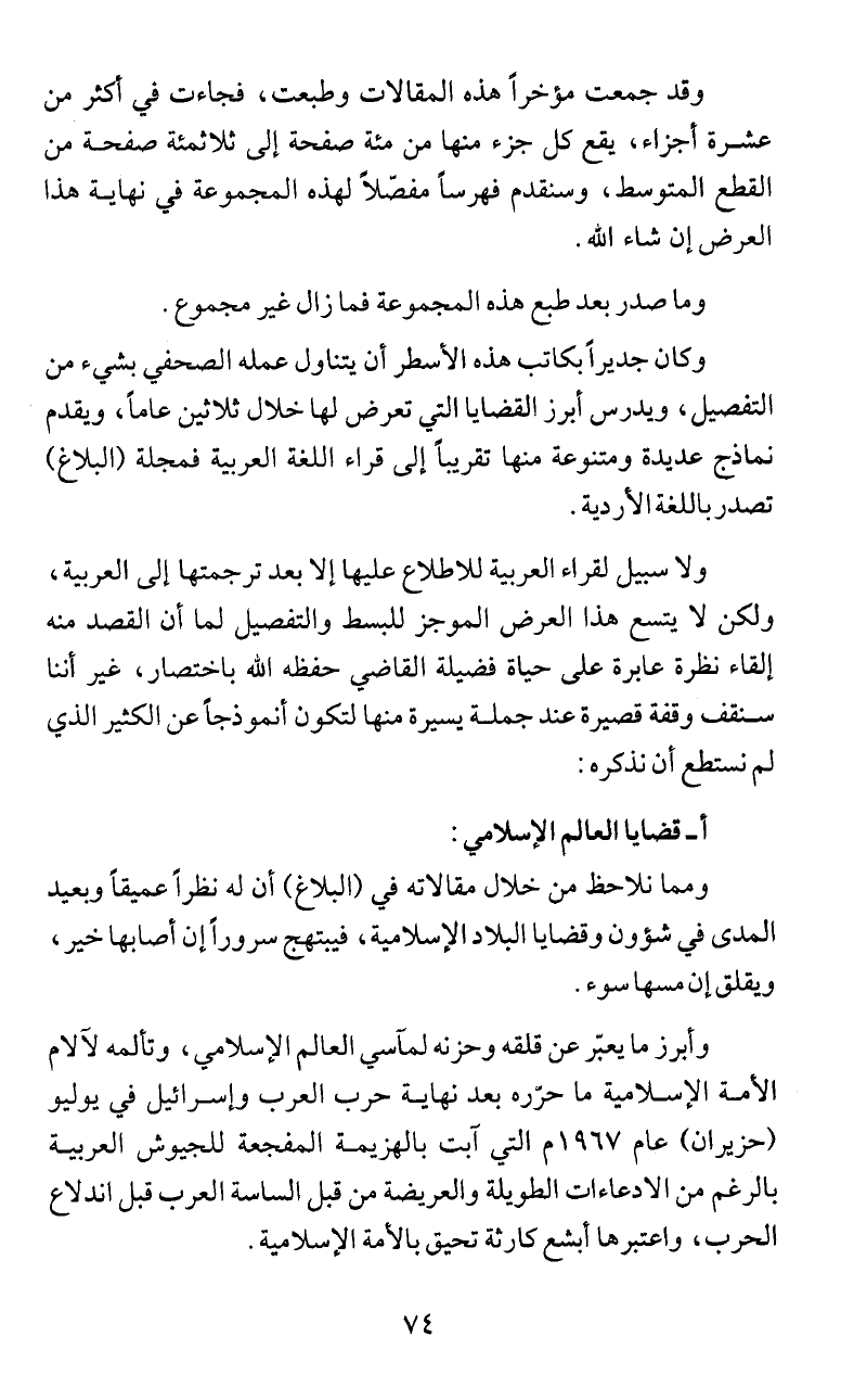 ومما نلاحط من خلال مقالاته في (البلاغ) أن له نظراً عميقاً وبعيد