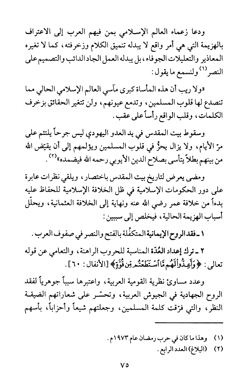 أسباب الهزيمة الحالية، فيخلص إلى سببين: