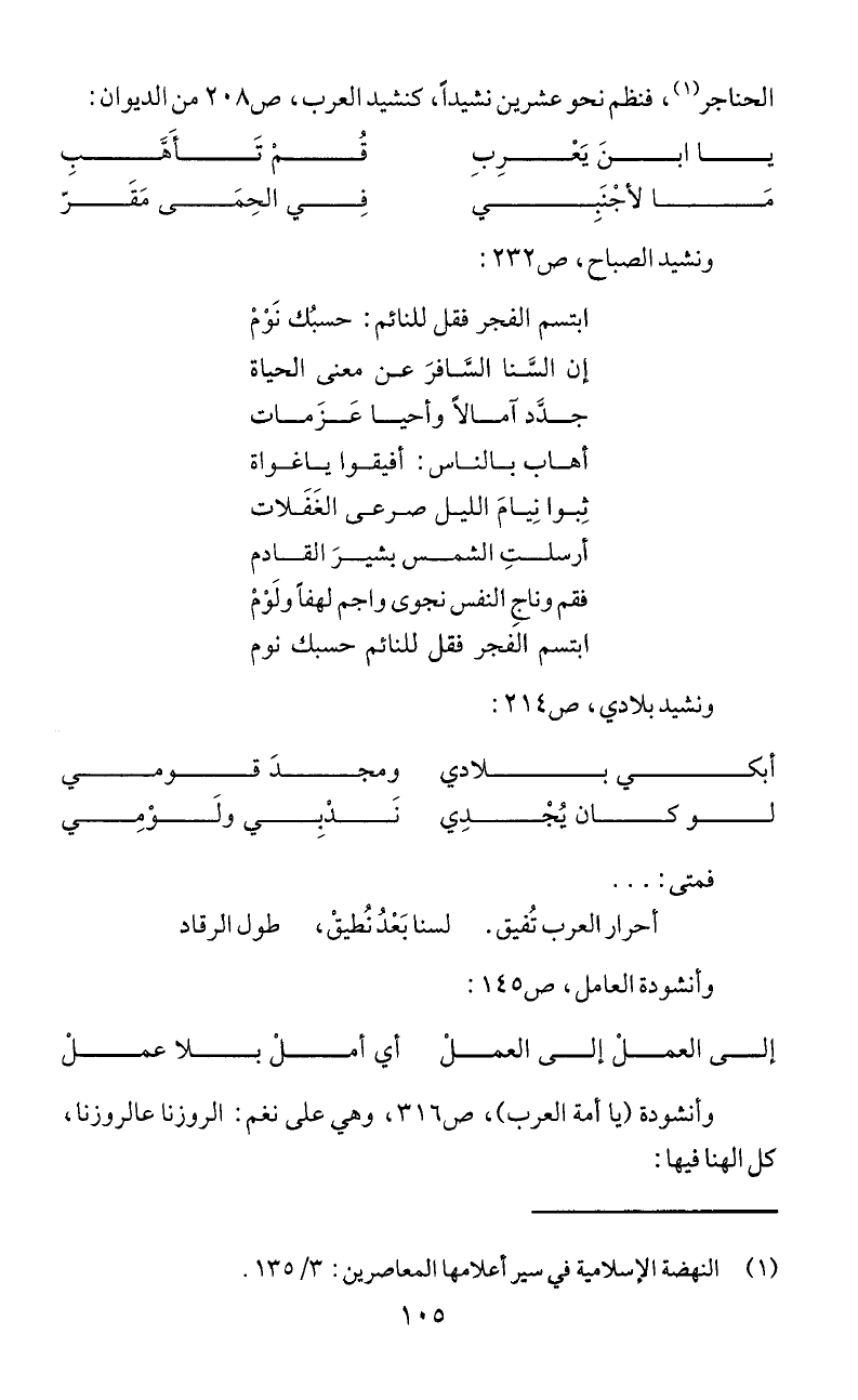 الحناجر (1)، فنظم نحو عشرين نشيداً، كنشيد العرب، ص 8 0 2 من الديوان: