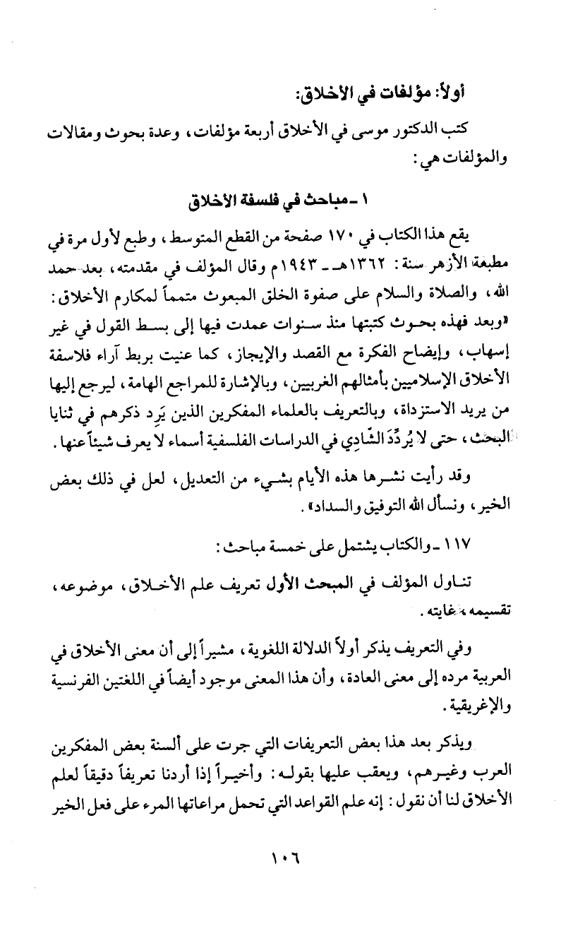 كتب الدكتور موسى في الأخلاق أربعة مؤلفات، وعدة بحوث ومقالات