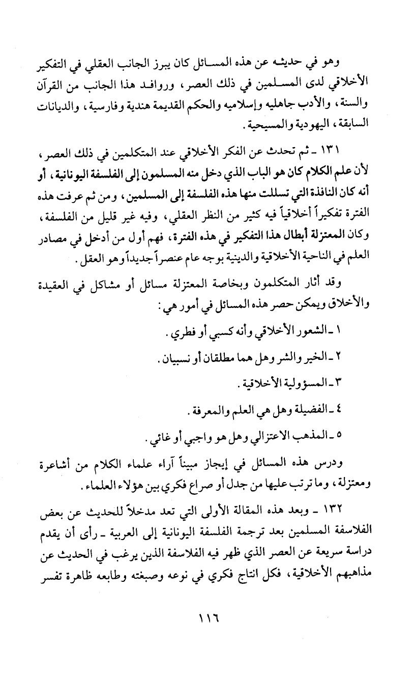131 - ثم تحدث عن الفكر الأخلاقي عند المتكلمين في ذلك العصر،