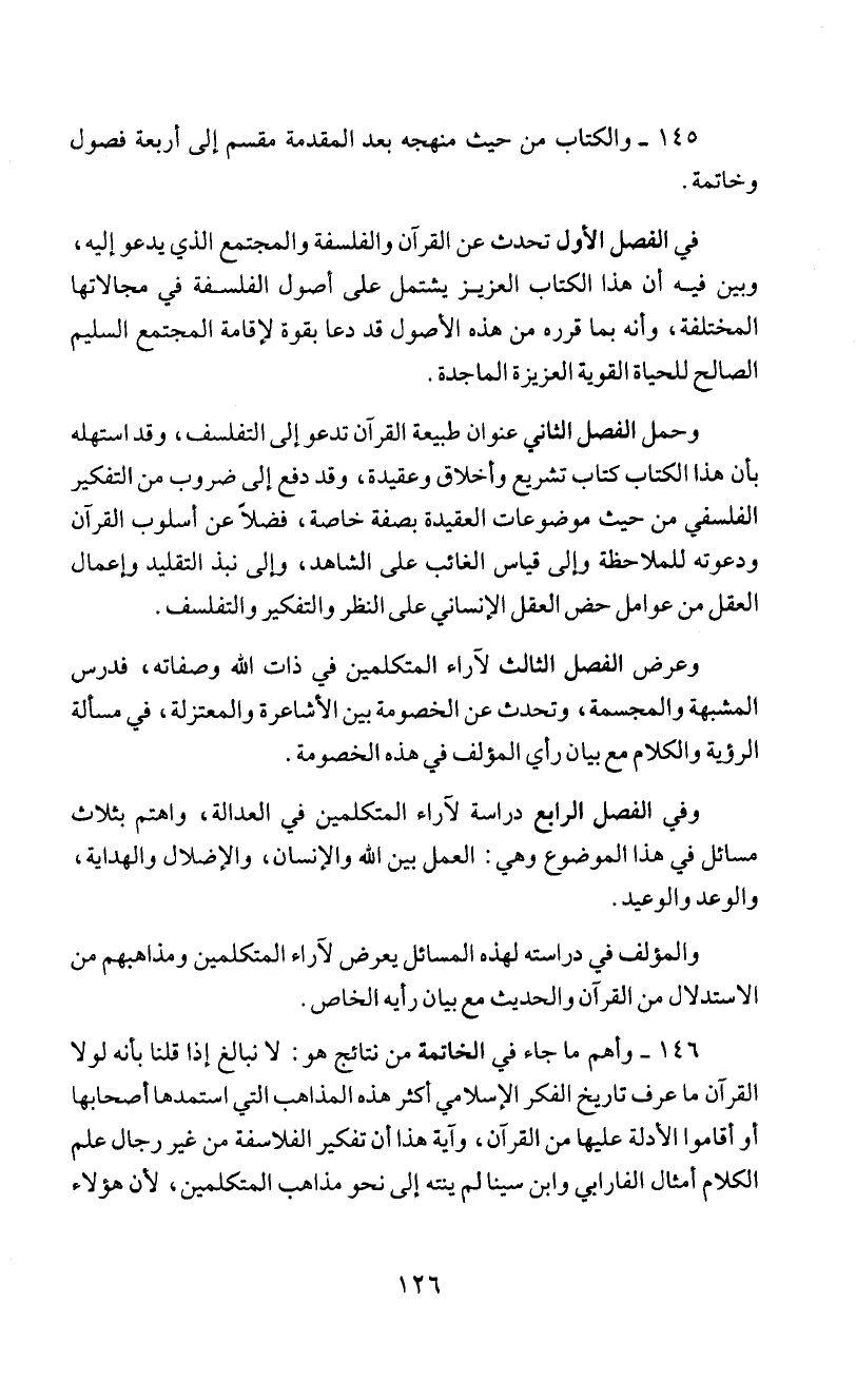 في الفصل الأول تحدث عن القرآن والفلسفة والمجتمع الذي يدعو إليه،