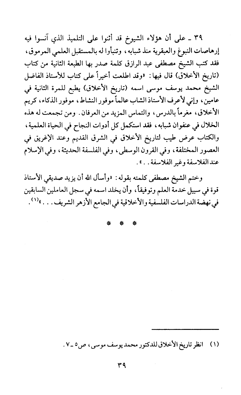 الشيخ محمد يوسف موسى اسمه (تاريخ الأخلاق) يطبع للمرة الثانية في