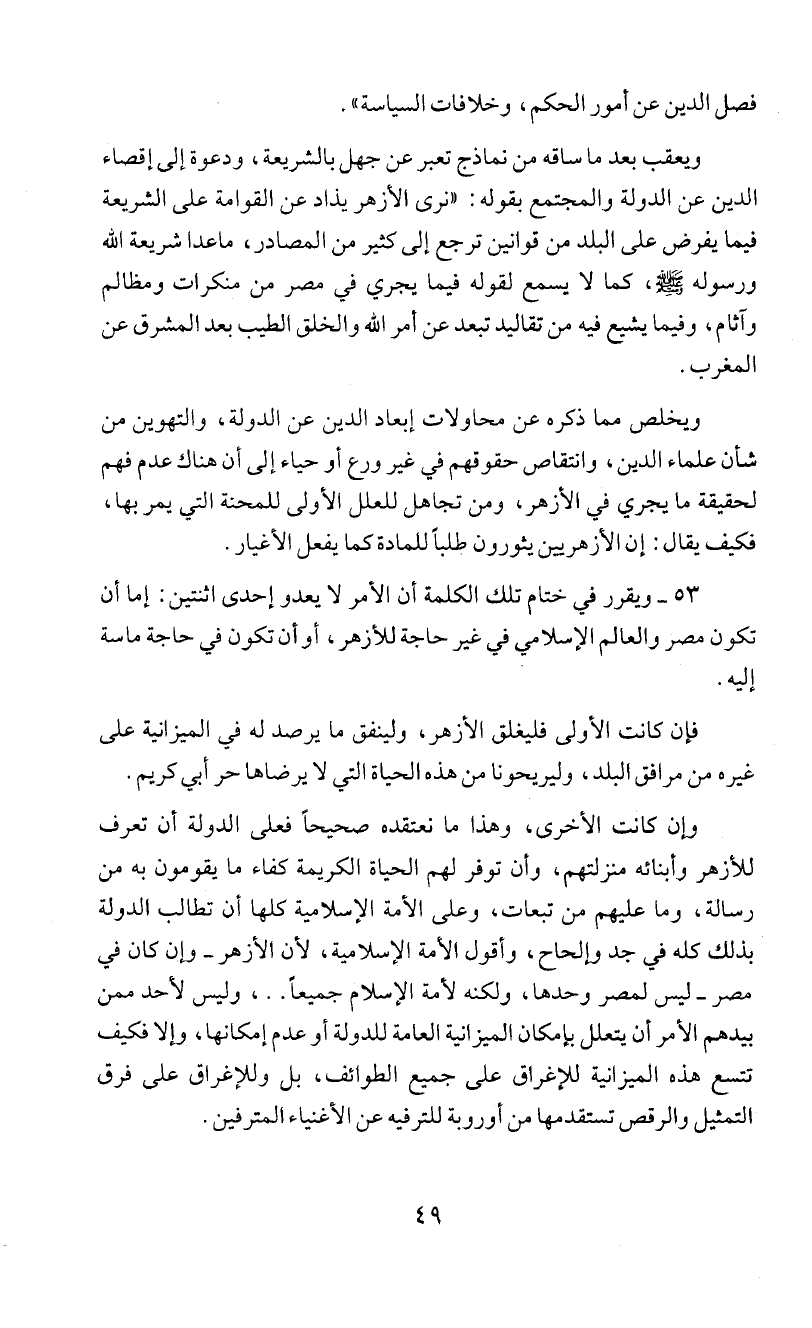 الدين عن الدولة والمجتمع بقوله: " نرى الأزهر يذاد عن القوامة على الشريعة