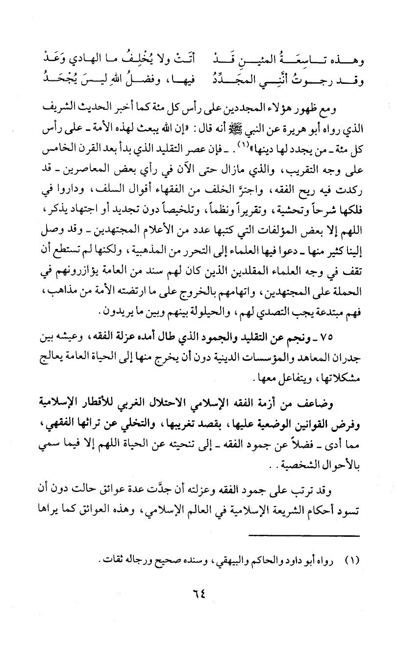75 - ونجم عن التقليد والجمود الذي طال أمده عزلة الفقه، وعيثه بين