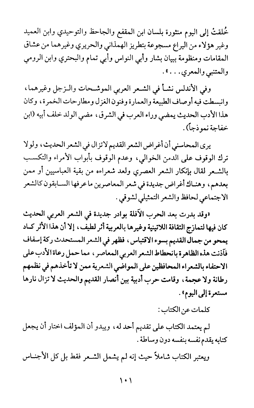 ويعتبر الكتاب شاملاً حيث إنه لم يشمل الشعر فقط بل كل الأجناس