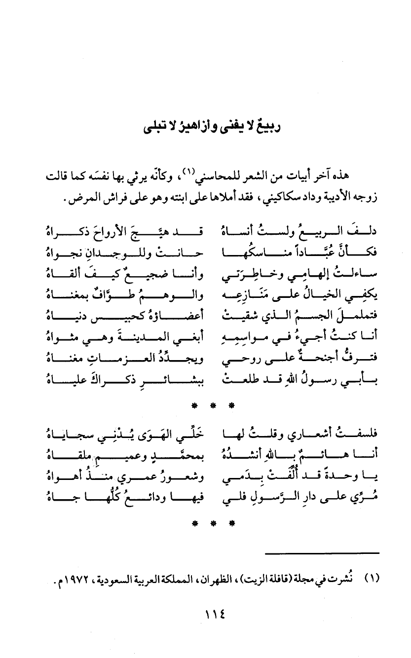 هذه اَخر أبيات من الشعر للمحاسني (1)، وكأئه يرثي بها نفسَه كما قالت