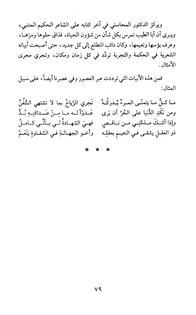 ويركز الدكتور المحاسني في آخر كتابه على الشاعر الحكيم المتنبي،