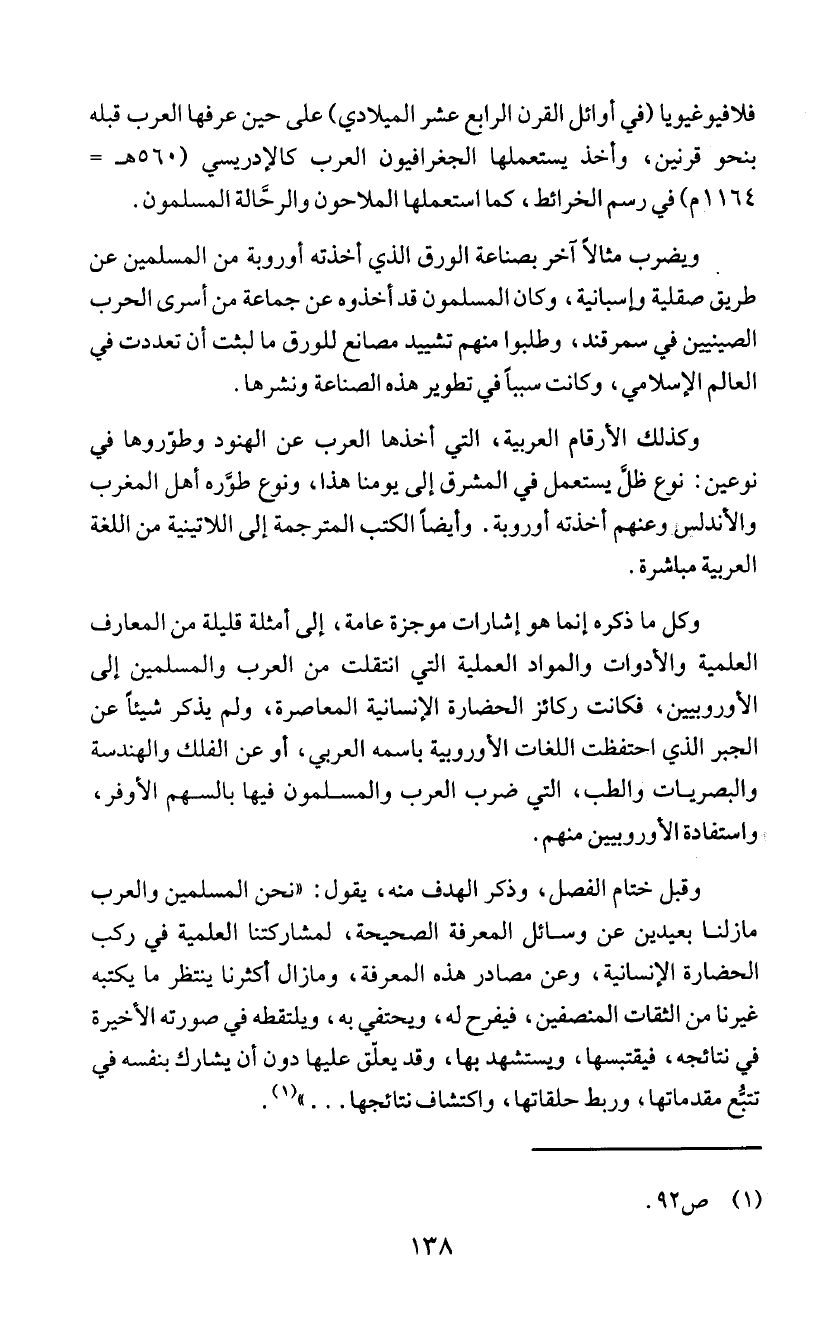 ويضرب مثالاَ اَخر بصناعة الورق الذي اخذته اوروبة من المسلمين عن