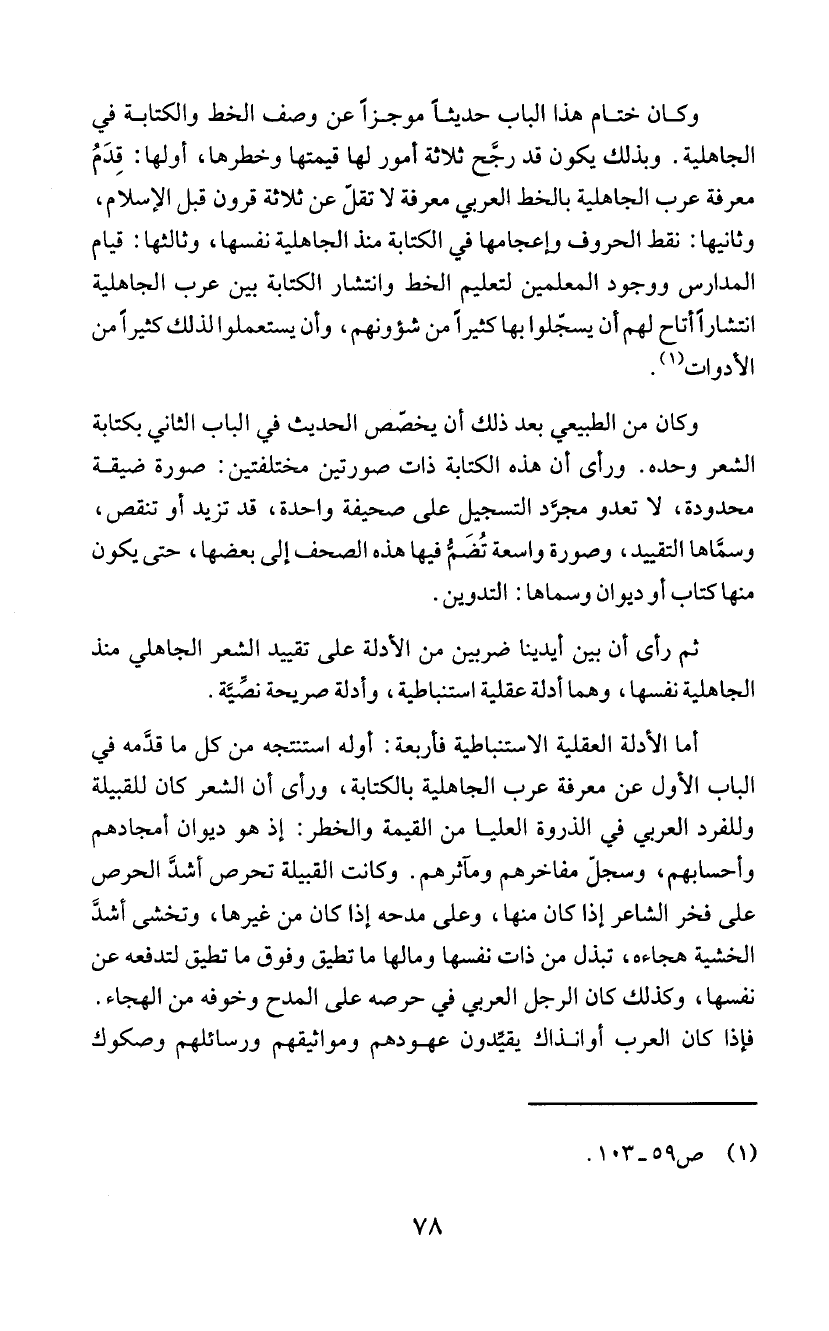 الباب الأول عن معرفة عرب الجاهلية بالكتابة، ورأى أن الشعر كان للقبيلة