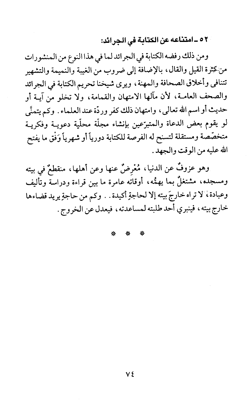 ومن ذلك رفضه الكتابة في الجرائد لما في هذا النوع من المنسْورات