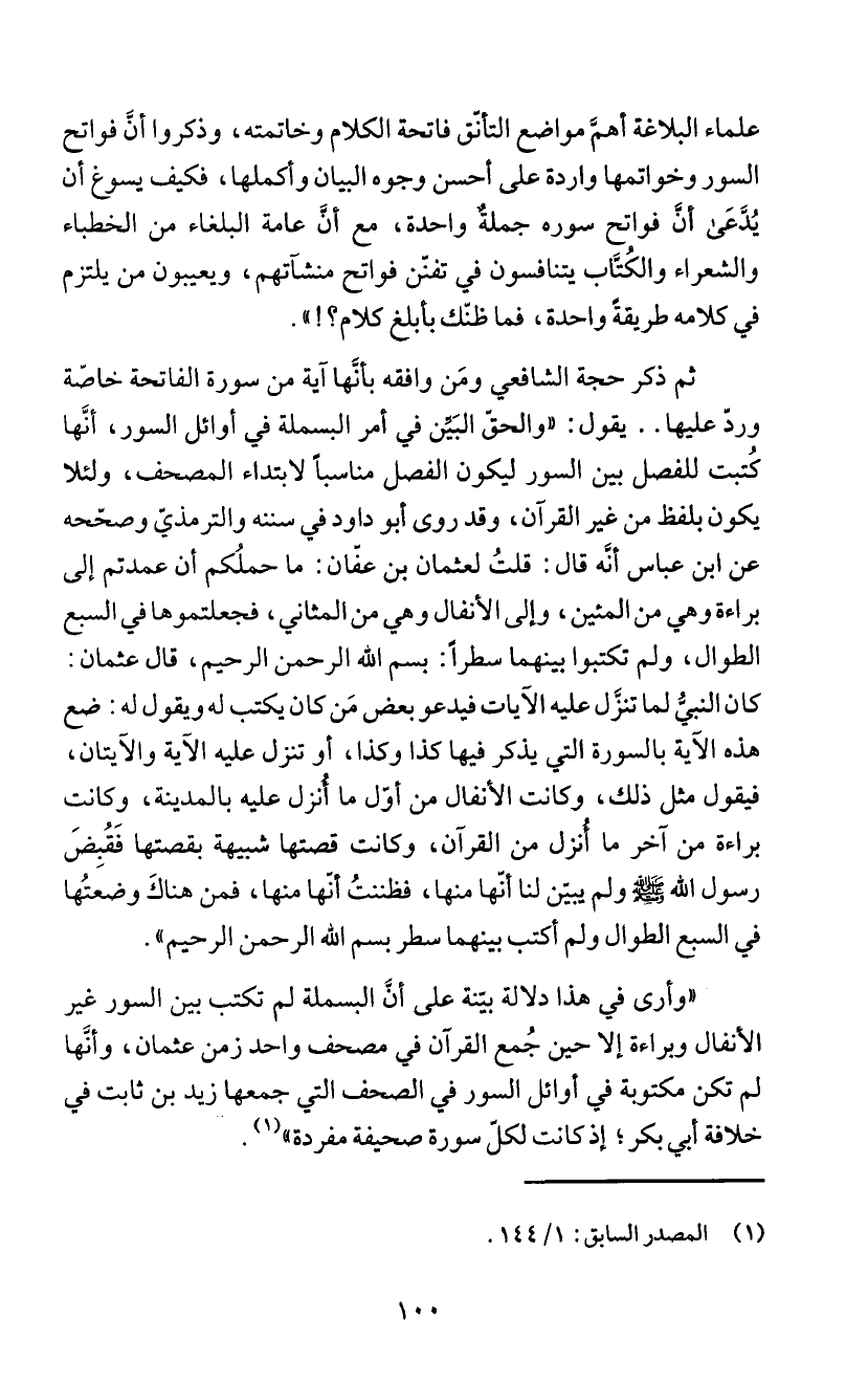 "وارى في هذا دلالة بثنة على انَ البسملة لم تكتب بين السور غير