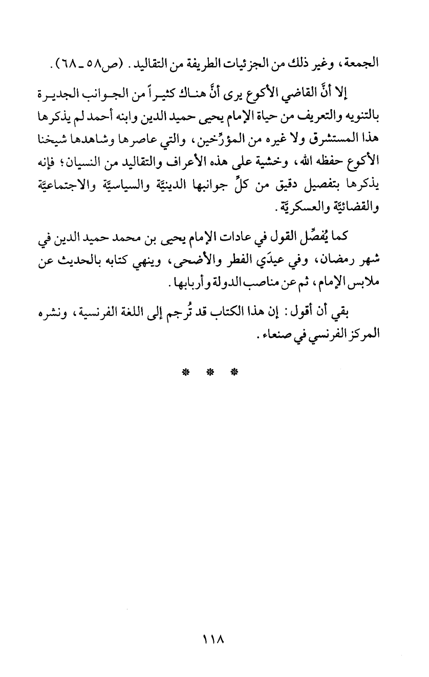 الجمعة، وغير ذلك من الجزئيات الطريفة من التقاليد. (ص 58 - 68).