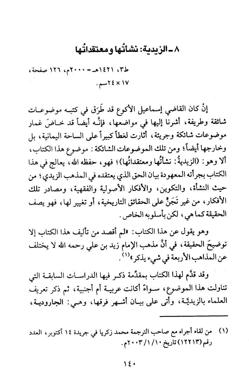 الا وهو: (الزيديةُ: نشاتُها ومعتقداتُها)؟ فهو، حفظه الله، يعالج في هذا
