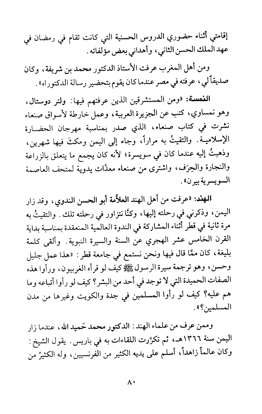 الهند: "عرفت من اهل الهند العلأَمة أبو الحسن الندوي، وقد زار
