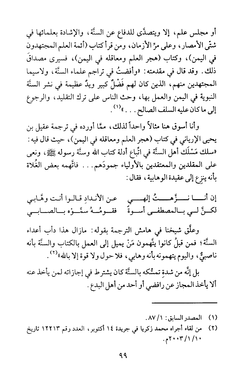 او مجلس علم، إلا ويتصدَى للدفاع عن السئة، والإشادة بعلمائها في