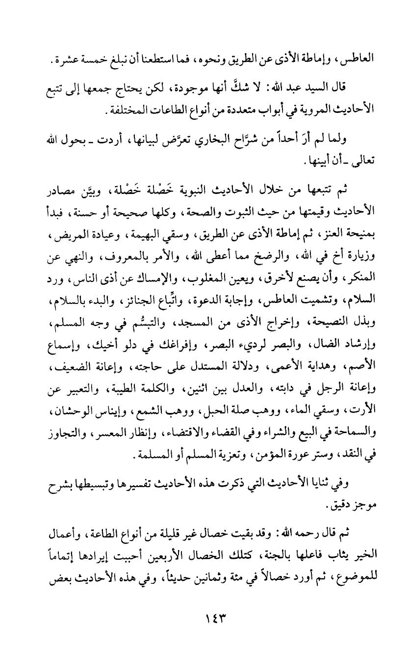 العاطس، وإماطة الأذى عن الطريق ونحو 5، فما استطعنا أن نبلغ خمسة عشرة.