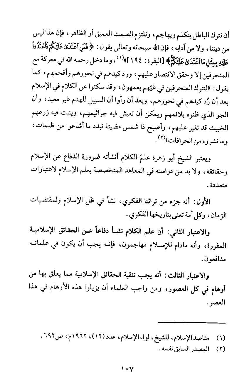 المقررة، وأنه مادام للإسلام مهاجمون، فإنه يجب أن يكون في علمائه
