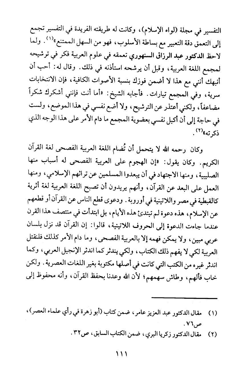 الكريم. وكان يقول: "إن الهجوم على العربية الفصحى له أسباب منها