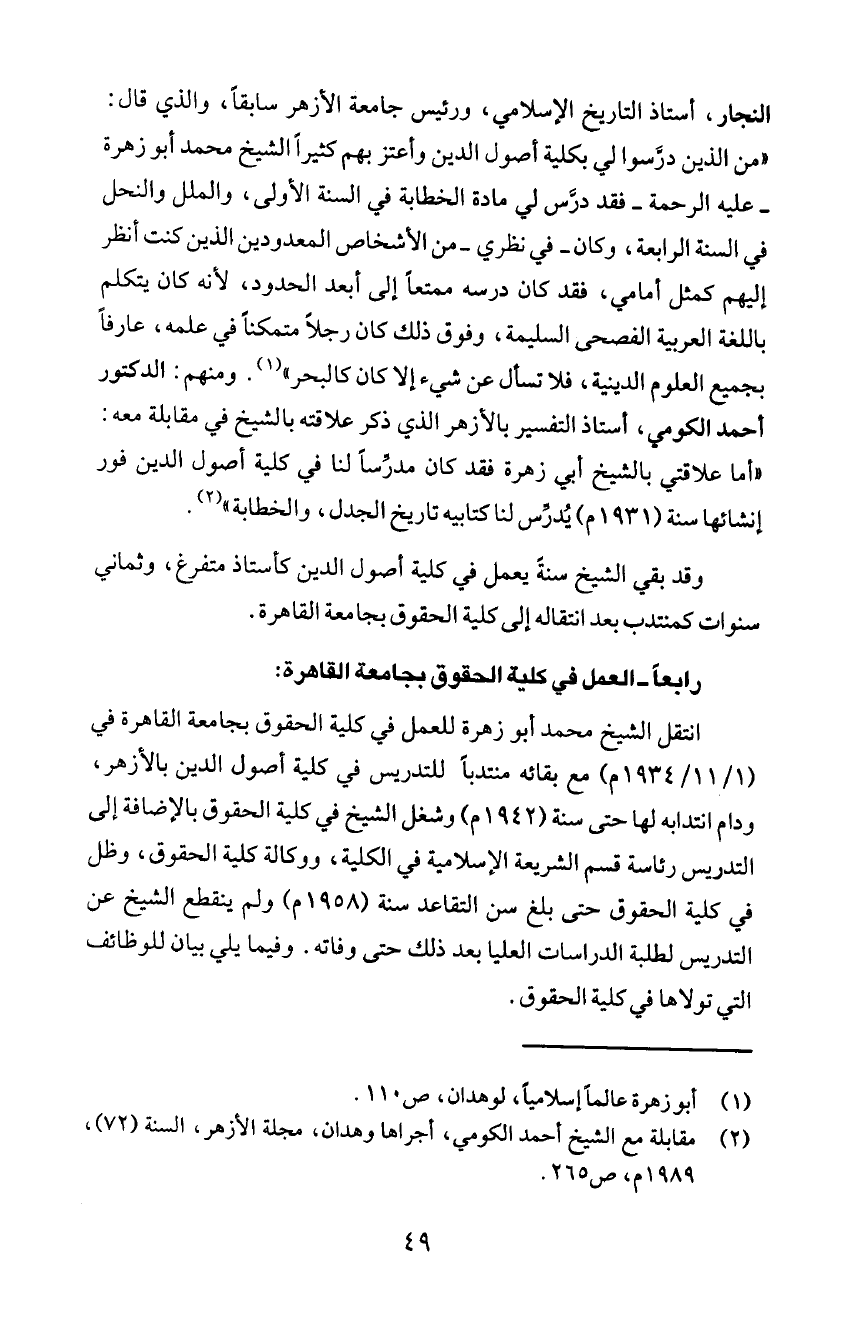 "أما علاقتي بالشيخ ابي زهرة فقد كان مدزساً لنا في كلية أصول الدين فور