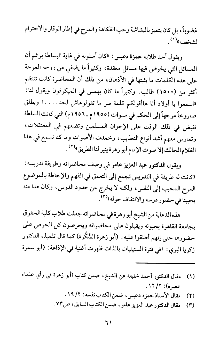 ويقول الدكتور عبد العزيز عامر في وصف محاضراته وطريقة تدريسه: