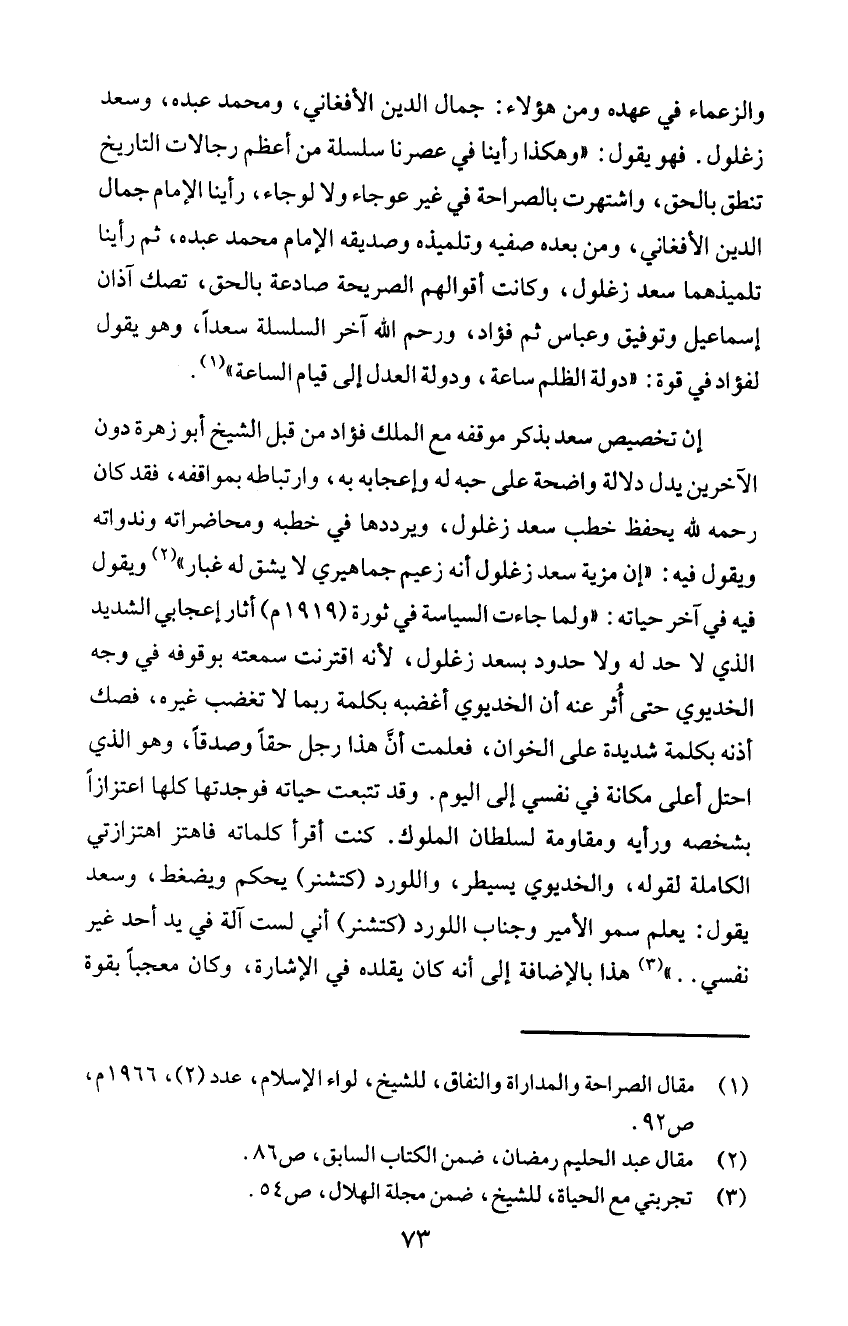 ويقول فيه: "إن مزية سعد زغلول أنه زعيم جماهيري لا يشق له غبار" (2) ويقول