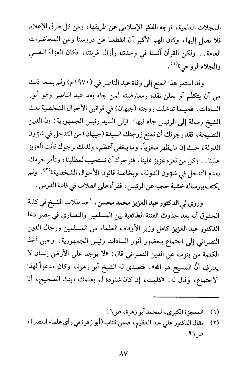وقد استمر هذا المنع إلى وفاة عبد الناصر في (1970 م) ولم يمنعه ذلك