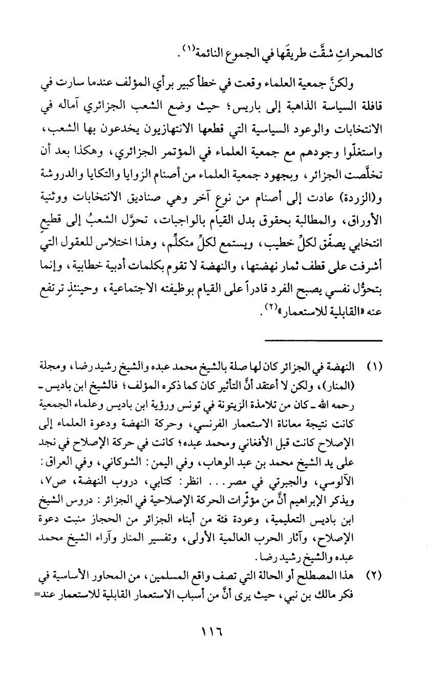 ولكنَ جمعية العلماء وقعت في خطأ كبير برأي المؤلف عندما سارت في