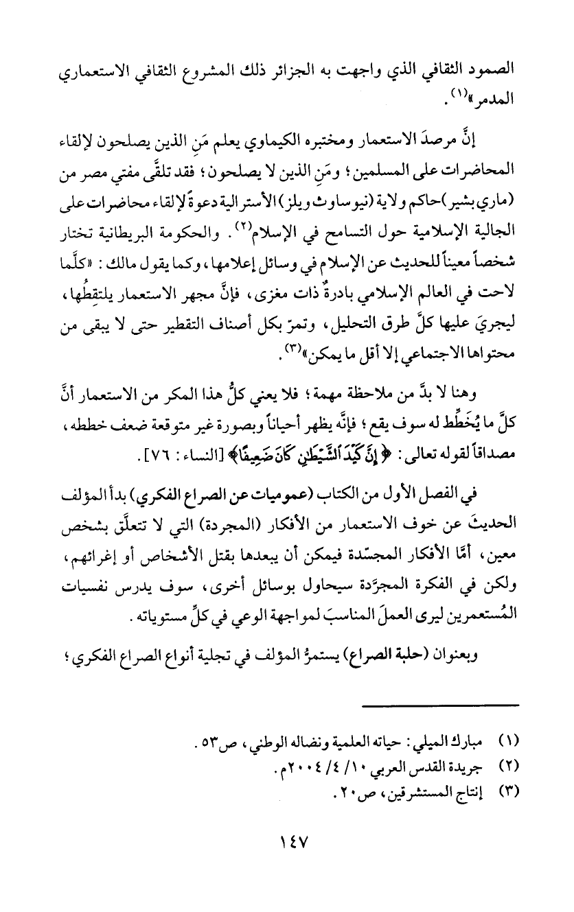 في الفصل الأول من الكتاب (عموميات عن الصراع الفكري) بدأ المؤلف