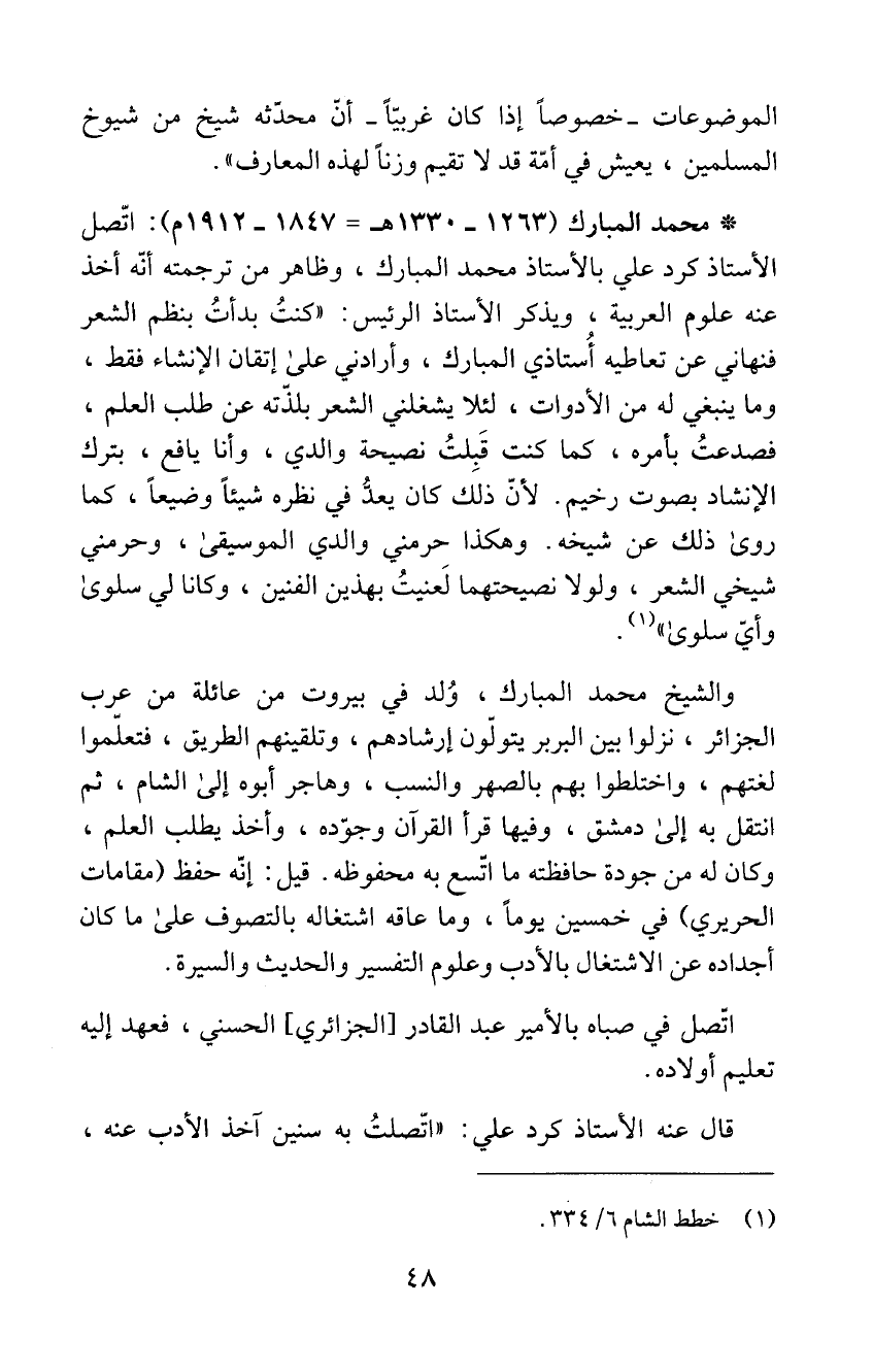 الأستاذ كرد علي بالأستاذ محمد المبارك، وظاهر من ترجمته انّه اخذ