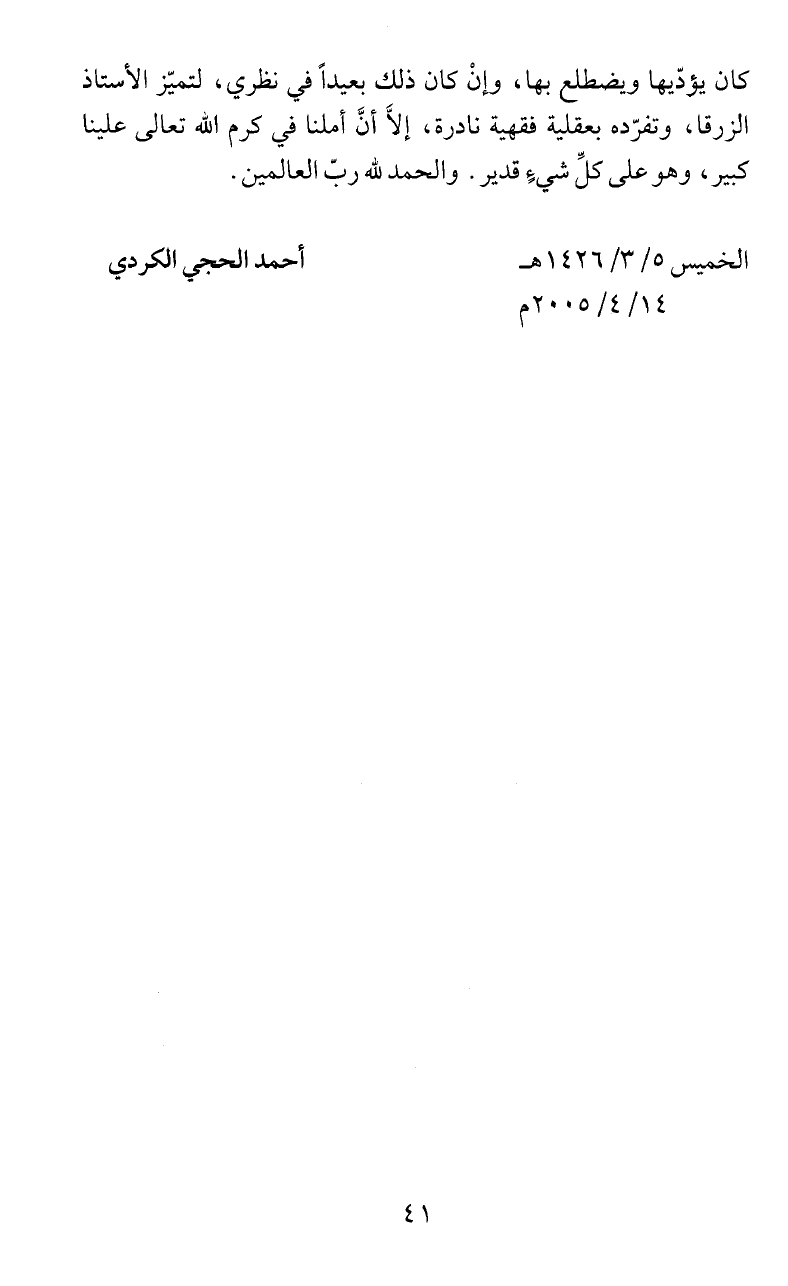 الزرقا، وتفرّده بعقلية فقهية نادرة، إلاَّ انَّ أملنا في كرم اللّه تعالى علينا