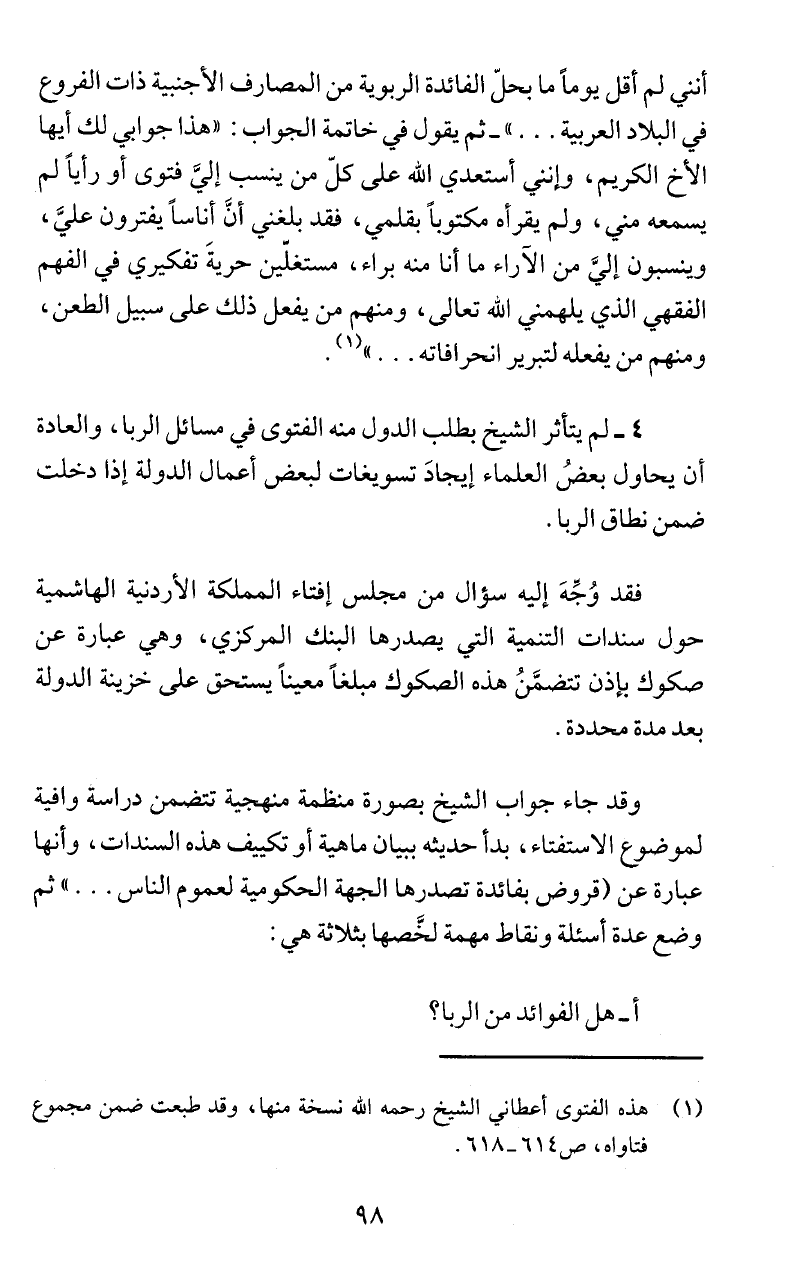 4 - لم يتأثر الشيخ بطلب الدول منه الفتوى في مسائل الربا، والعادة