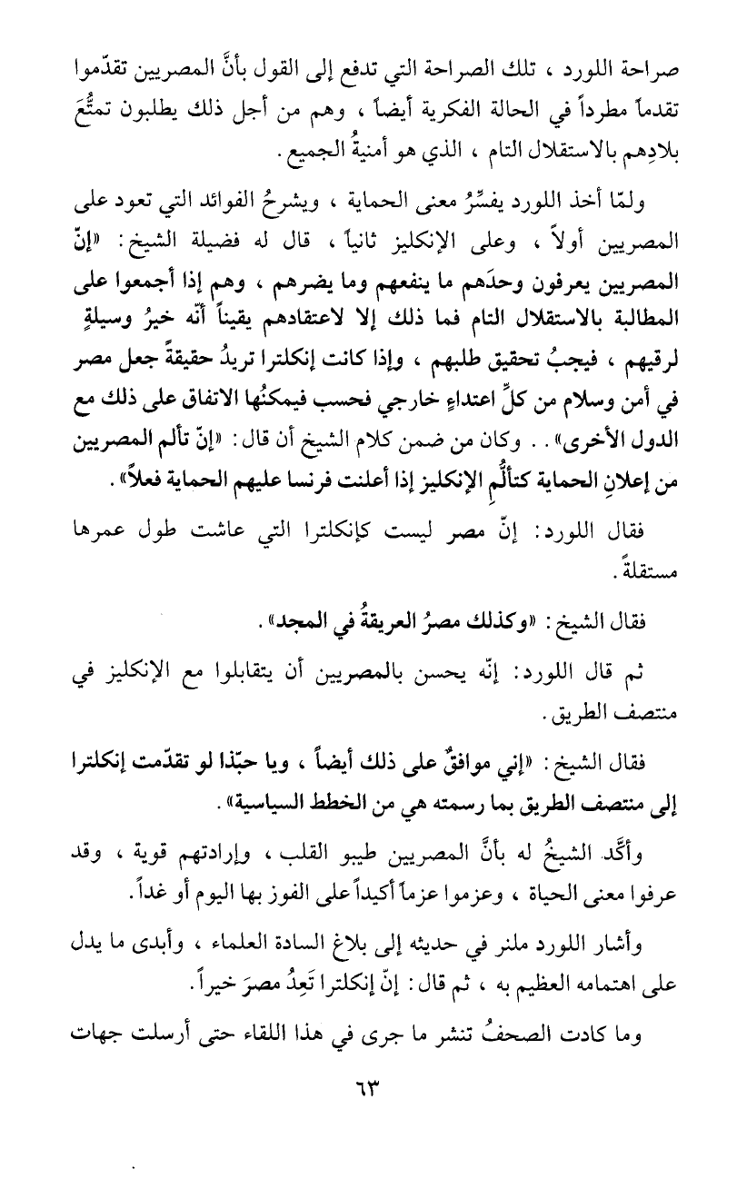 ثم قال! اللورد: إنّه يحسن بالمصريين ان يتقابلوا مع الإنكليز في