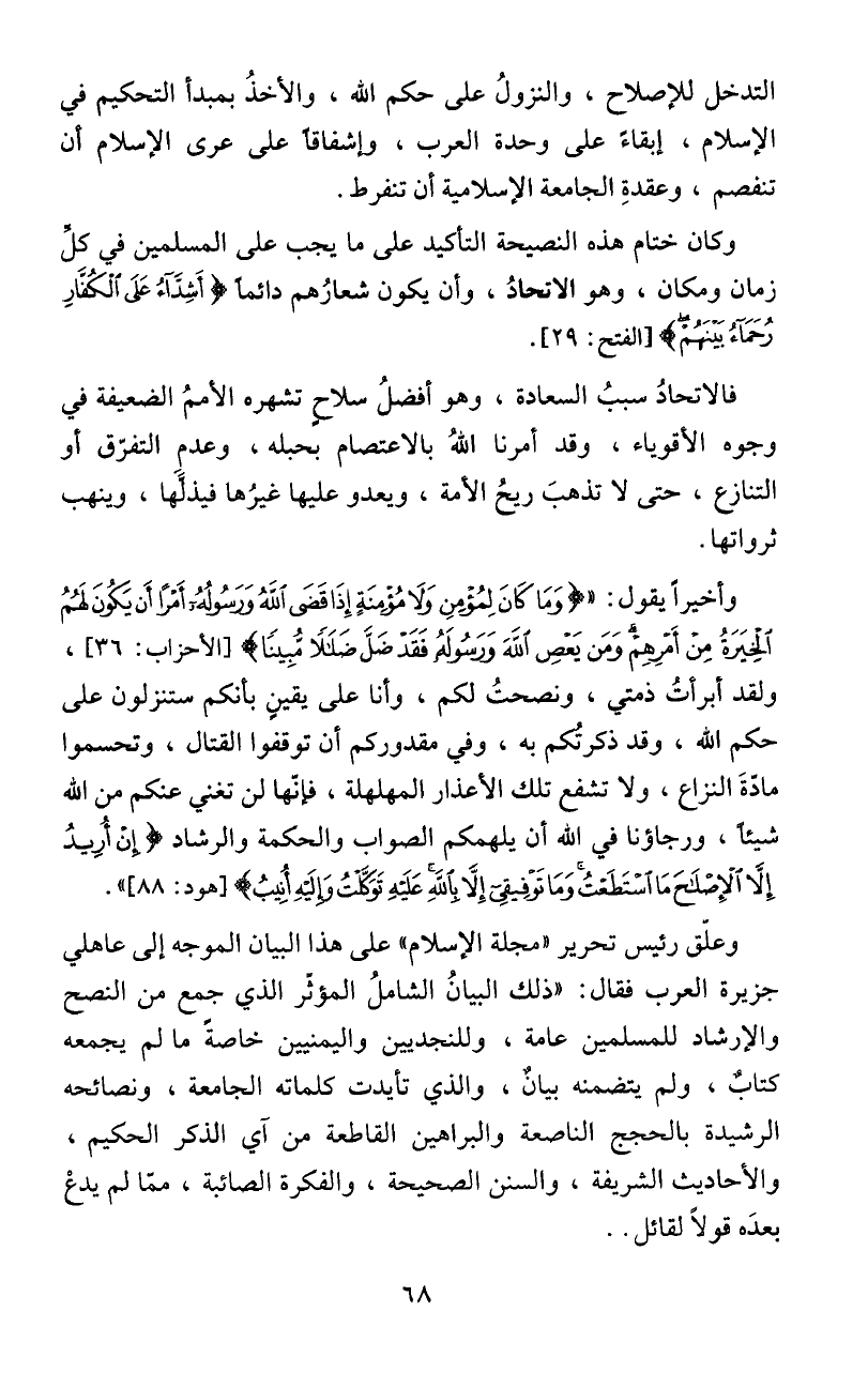 الإسلام، إبقاءً على وحدة العرب، وإشفاقأ على عرى الإسلام أ ن