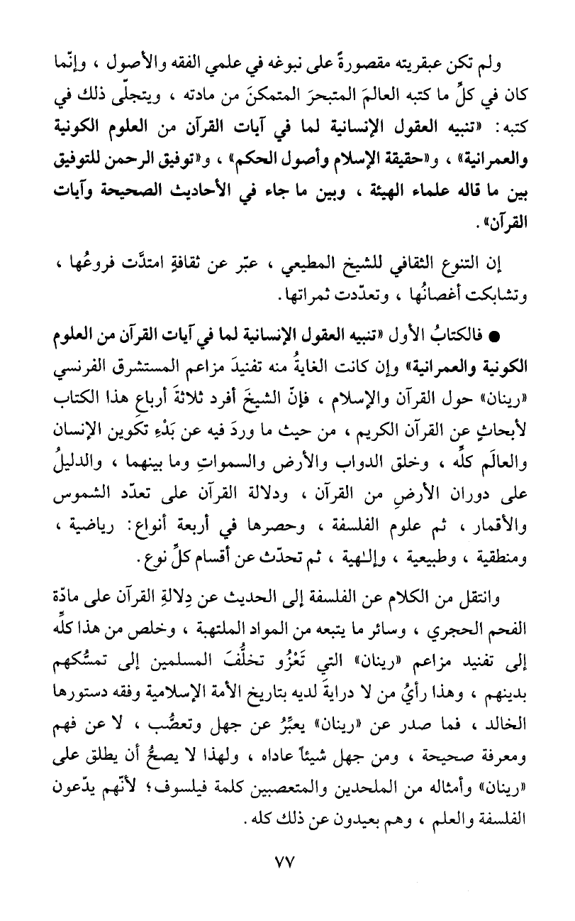 "رينان" حول القرآن والاسلام، فإنّ الشيخَ افرد ثلاثةَ ارباعِ هذا الكتاب