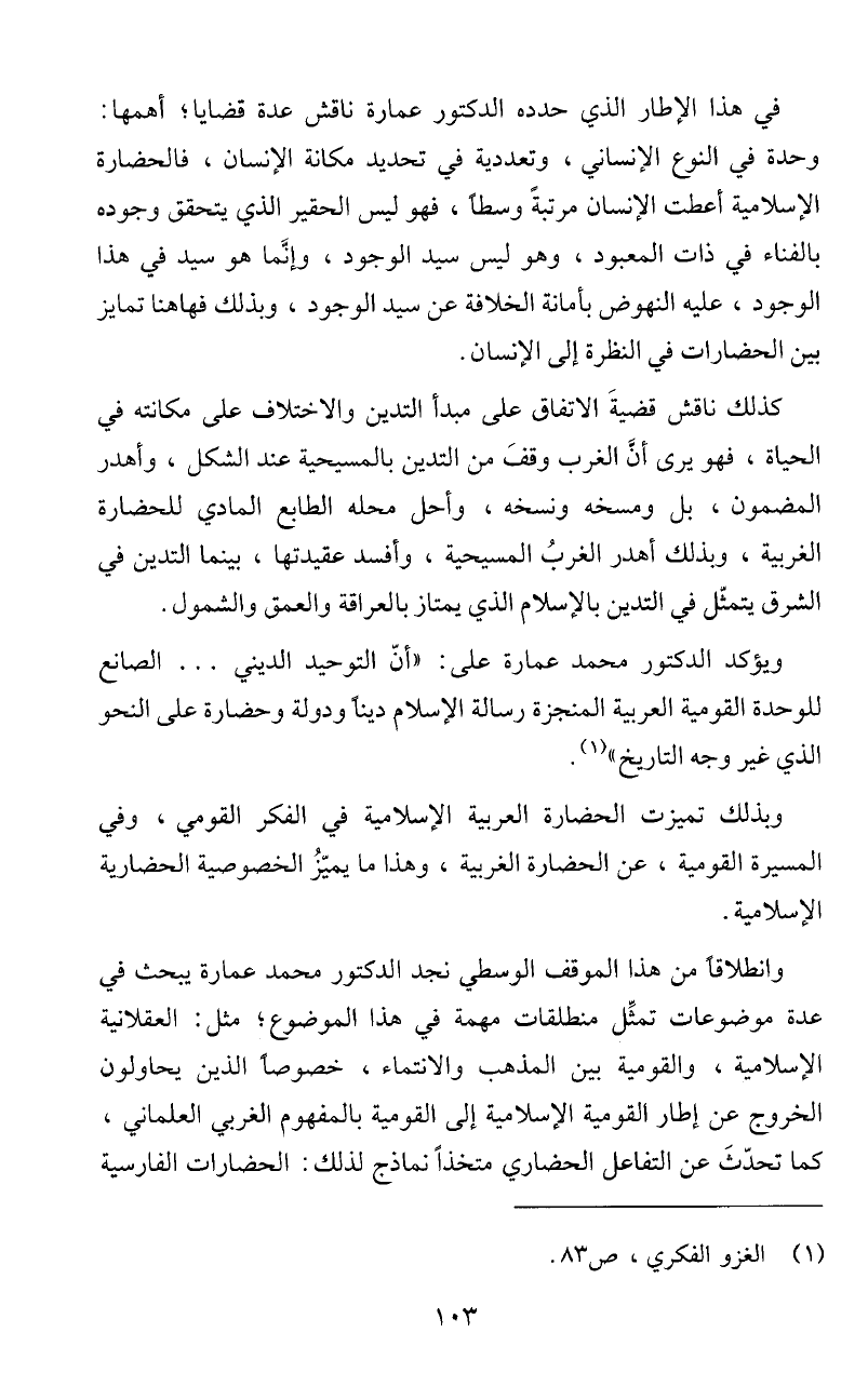 وانطلاقأ من هذا الموقف الوسطي نجد الدكتور محمد عمارة يبحث في